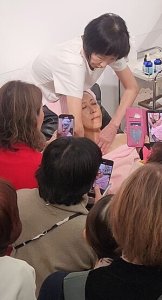 新製品のフォームやゴールドクリームを使った小顔美点マッサージをデコルテや鎖骨美点を加えたデモンストレーション。より小顔になりました!